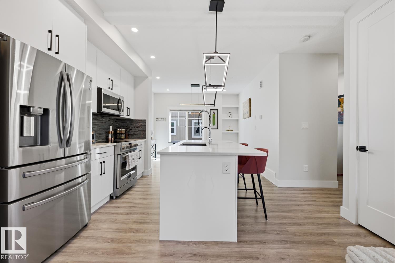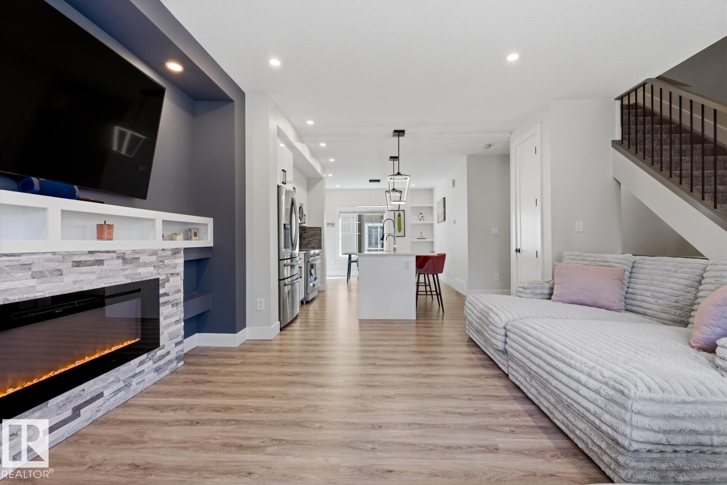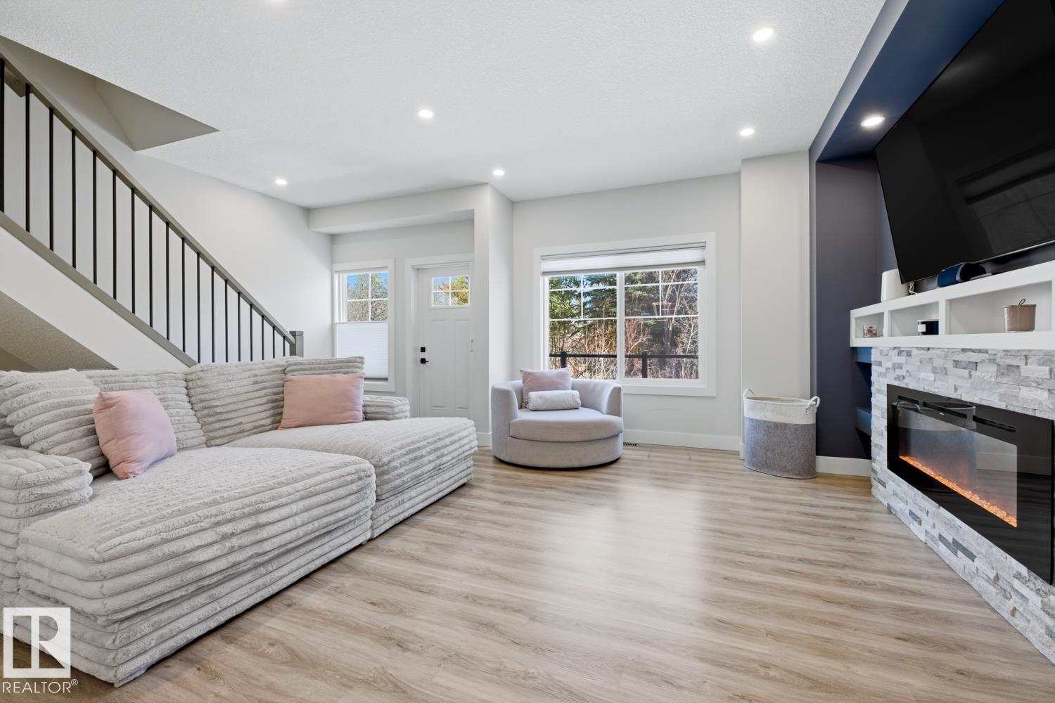 Serene views over treed land in Edgemont—privacy, no neighbours looking in, and a true sense of tranquility. End-unit LUX townhouse with double attached garage, patio, balcony, and A/C. This 3-level executive home offers a bright, open layout with upgrades throughout: iron railing, quartz countertops, stainless steel appliances, 5’ linear fireplace with stone mantel, luxury vinyl plank flooring, beautiful tile, and added retractable screens that tuck away neatly. Ground level features a versatile office/fl...